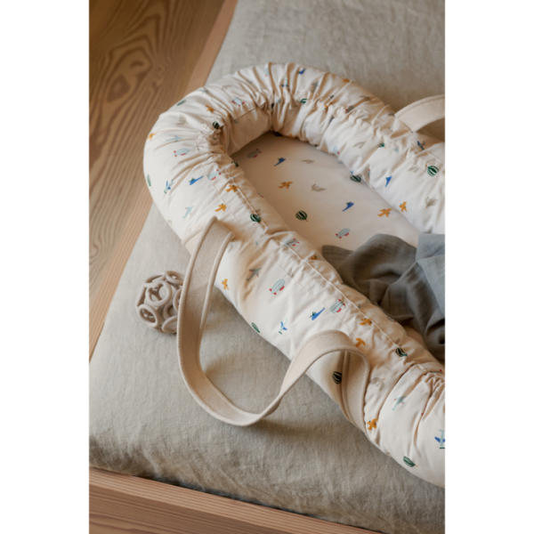 The perfect union of a baby lift and nest: Practical handles make it easy to carry with you around the house or when going to the pram or car. The cover is made of the softest organic cotton adorned with cheerful LIEWOOD prints which can be removed and washed.