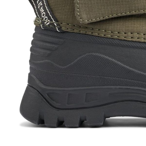 Winter boots featuring a sturdy bean boot sole for reliable traction. Equipped with a waterproof 3H membrane to keep feet dry and soft recycled polyester lining for warm comfort. Features a wide hook and loop strap closure and padded collar for a secure fit and comfort. Insole with arch support for additional comfort.