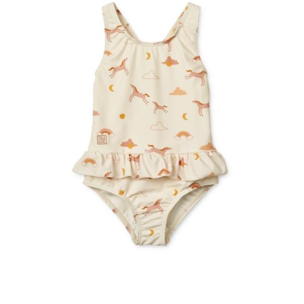 Let your little one jump into the pool or waves in the printed Amara swimsuit. This popular swimsuit offers playful details like a gathered flounce at the waist and crossing shoulder straps at the back.