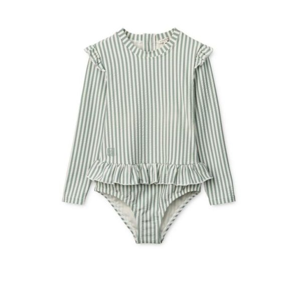 The Sille baby swimsuit combines a playful expression with UV protection for family time spent by the water. Features playful ruffles on shoulders and waist, a back zipper and practical snap button closure at the bottom.