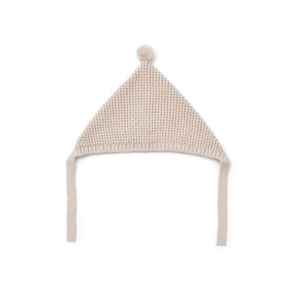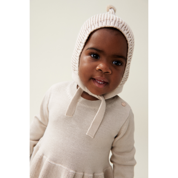 Knitted baby hat featuring a playful pompom on top. Designed with long strings for easy adjustment. Crafted from delicate cotton knit quality.